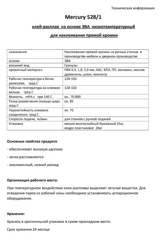 Клей-расплав относится к группе "ЭВА-клеи-расплавы". Обеспечивает приклеивание ПВХ-, АБС-, ХПЛ-, ПП, меламиновых кромок, древесины, шпона, полиэстра.