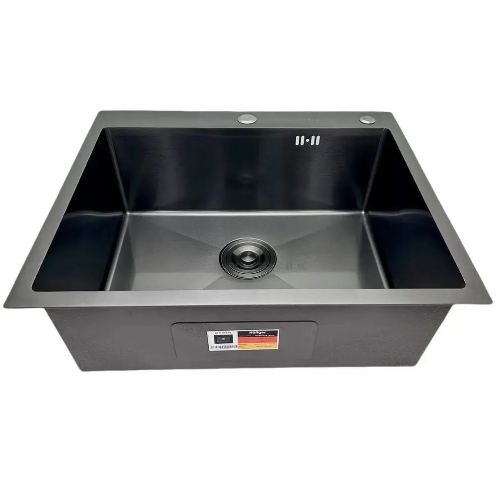 Мойка для кухни HOFFGER 6045 BLACK. Многофункциональная кухонная мойка Hoffger HFG-6045B Black чёрный графит, с двумя отверстиями под смеситель и дозатор.Изготовлена из высококачественной нержавеющей стали AISI304 с PVD покрытием, которое придает изделию особую прочность и коррозионную устойчивость. Цвет графит при ярком освещении темно-серый, при приглушенном приближенно черный. Толщина борта мойки 3 мм, толщина чаши 1 мм. Мойка имеет закруглённые внутренние углы и дно с небольшим уклоном, чтобы вода не застаивалась в чаше - эти свойства облегчают дальнейший уход за ней. Имеет шумоизолирующее покрытие и накладки с обратной стороны, которые делают мойку тихой при эксплуатации. Монтаж врезной над столешницей, накладная. Устанавливается на силикон или жидкие гвозди, прижимается собственным весом, крепежи в комплект не входят.