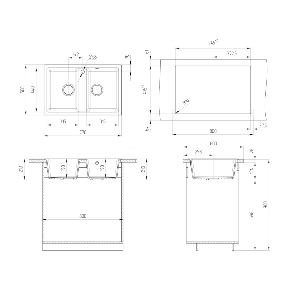 ULGRAN U-608 – двухсекционная кухонная мойка с отверстием под смеситель и двумя вместительными чашами. Данная мойка устанавливается в шкаф шириной от 80 см.
