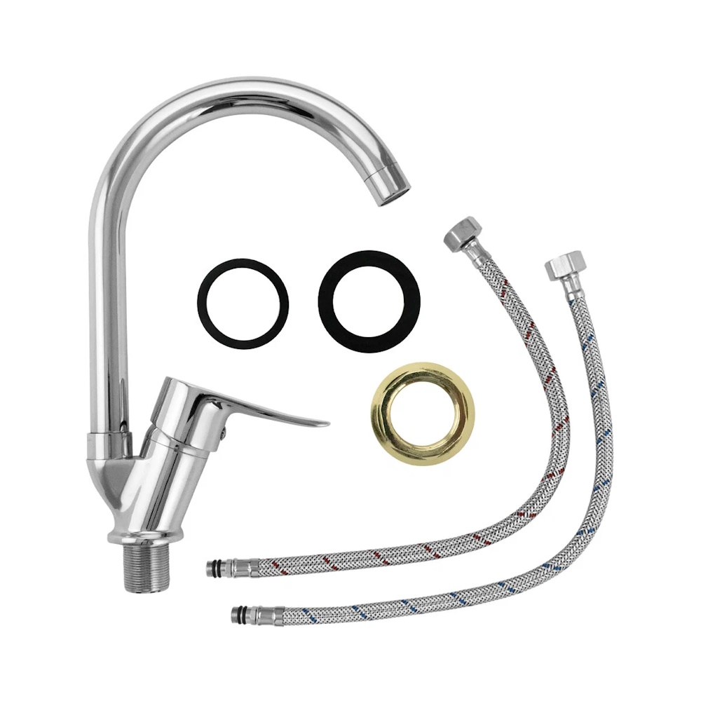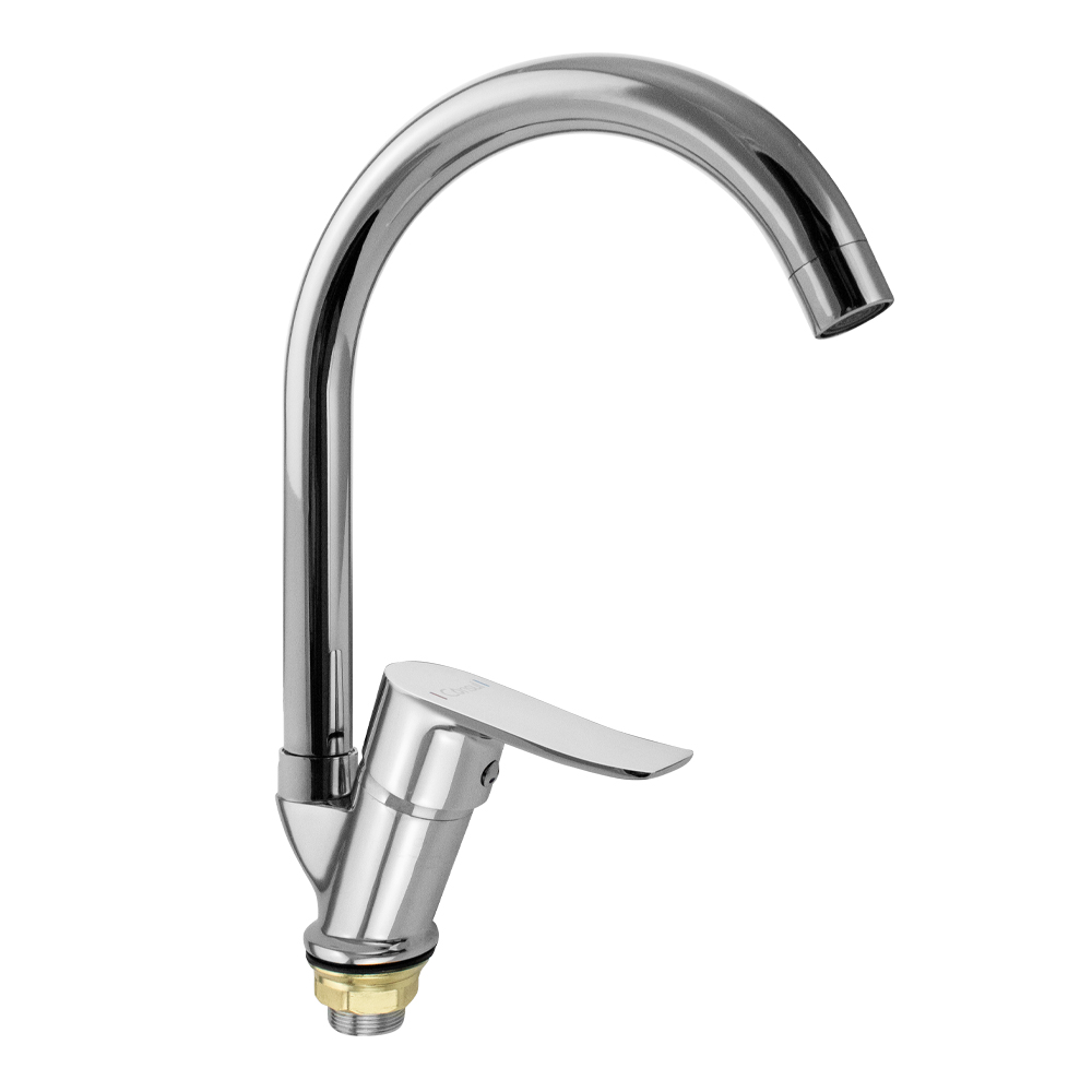 Смеситель для кухонной мойки и раковины, хромированный, с длинным, поворотным изливом, шаровый. Крепление резьба - гайка, ручка с дыркой, картридж d=40мм. Аэратор для экономии воды. Габаритные размеры: высота 100 мм, длина 240 мм, длина излива 200мм, диаметр посадочного седла 50 мм, длина резьбы 30 мм , длина подводки 400 мм, вес - 0,950 кг, объём - 0,00293 м3. В комплекте паспорт, корпус, подводка 1/2, крепеж, набор прокладок.